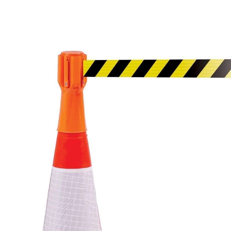 This cone top retractable belt cassette turns a standard traffic cone into a practical belt barrier whenever you need a quick, tidy way to control access. The built‑in yellow/black belt extends up to 3.65 m and retracts back into the housing automatically. Pull the belt to the next cone, clip it on, and you have a visible line that tells people where they can and cannot go. When the job is done, unhook the belt and it rewinds neatly on its own, ready for the next task.