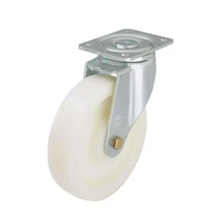 Nylon is the right choice when floors are dusty, oily or strewn with chips. The hard, non‑marking tread resists oil, cutting fluids and most shop chemicals, so the wheels keep turning rather than picking up debris. Sealed ball bearings keep the swivel action light and the rolling resistance low, even across concrete expansion joints and occasional weld beads.