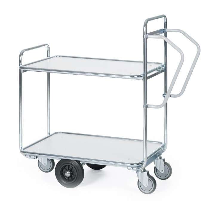 The structure is practical and direct: rounded corners, laminate shelves, a grey plastic-coated handle and wheel geometry that supports the load instead of fighting against it. In use, that means the trolley feels stable in a long aisle, easier to turn when the route narrows and less awkward to control when the shelves are full.