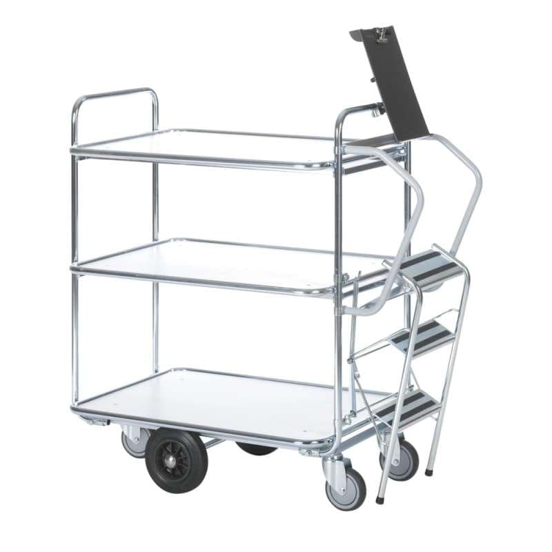 When picking routes get longer and shelf levels get higher, this order picking trolley with steps keeps the work moving. It combines a 300 kg load capacity with a light, easy-rolling feel and an integrated 600 mm step unit, so one trolley can handle both transport and higher pick levels.