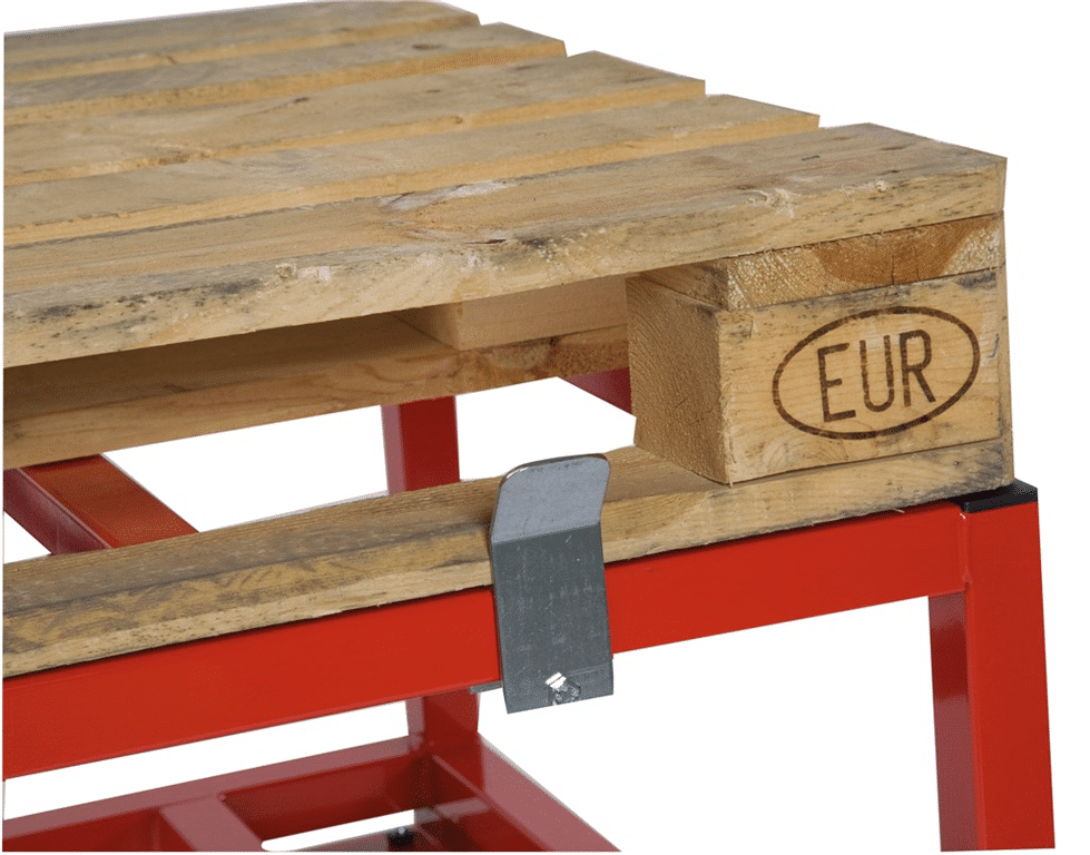 These pallet holders are designed as an accessory for compatible pallet trolleys and help lock an EUR pallet or FIN pallet in place on the frame. That gives you steadier handling when moving loads through the warehouse, production area or workshop.