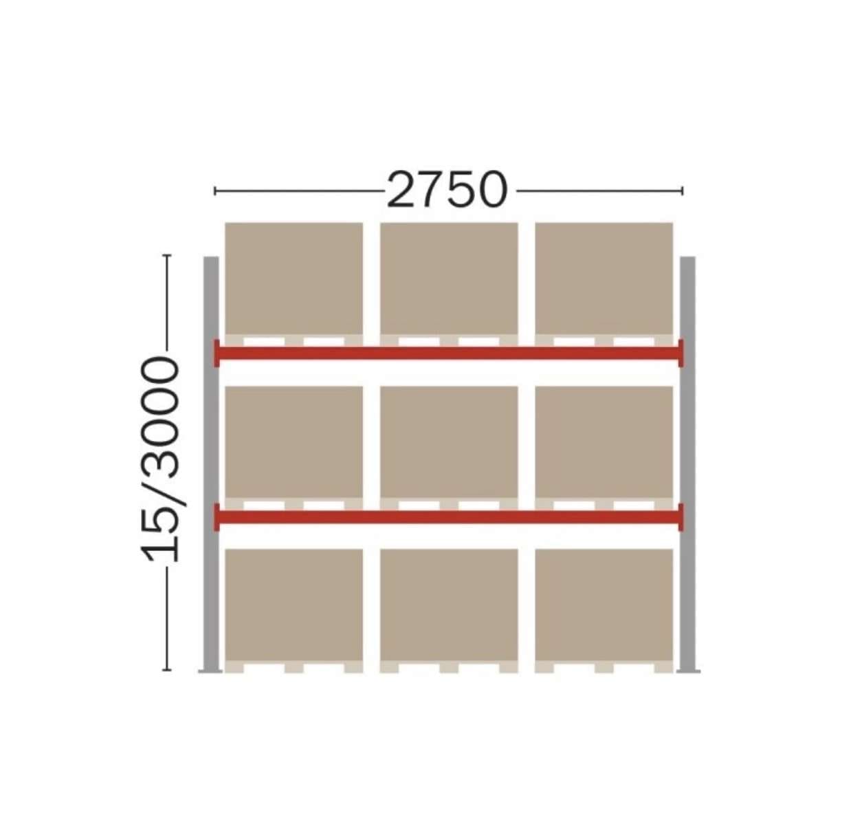 The bay provides 9 Euro pallet positions in one complete starter section. With a bay width of 2750 mm and a depth of 1050 mm, it is designed for a practical three-pallet-wide arrangement. The rack height is 3000 mm, giving you vertical storage that helps free up valuable floor space while keeping loads accessible for forklift handling.