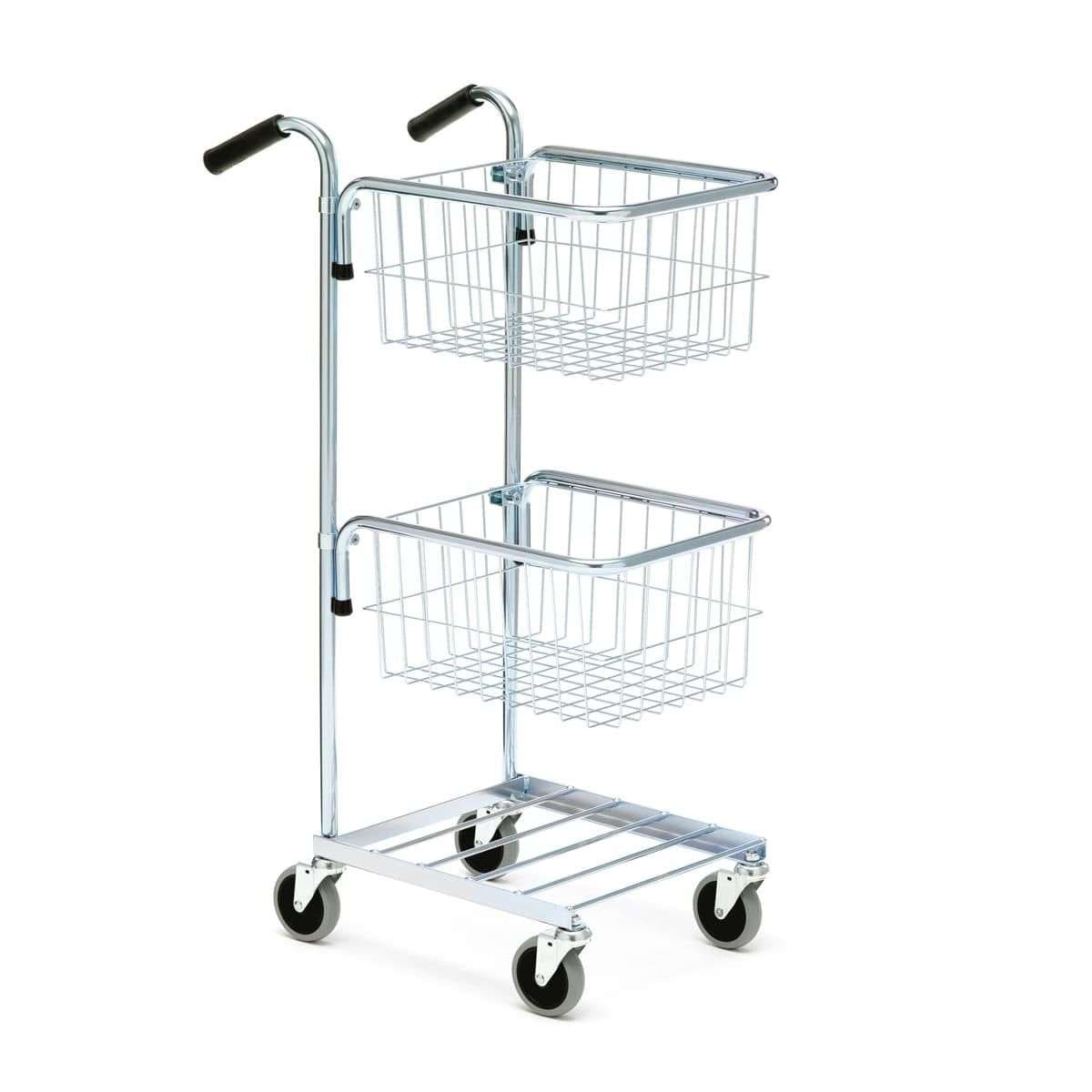Choose the layout that suits the work. The basket trolley version keeps loose items contained, the shelf trolley version gives you a flat surface for files, boxes and supplies, and the combined model handles mixed loads on the same route. Shelves and baskets can be adjusted in height without fixed steps, so the trolley is easy to adapt when item sizes change. Every model also includes a fixed bottom grid shelf for extra storage during the round.