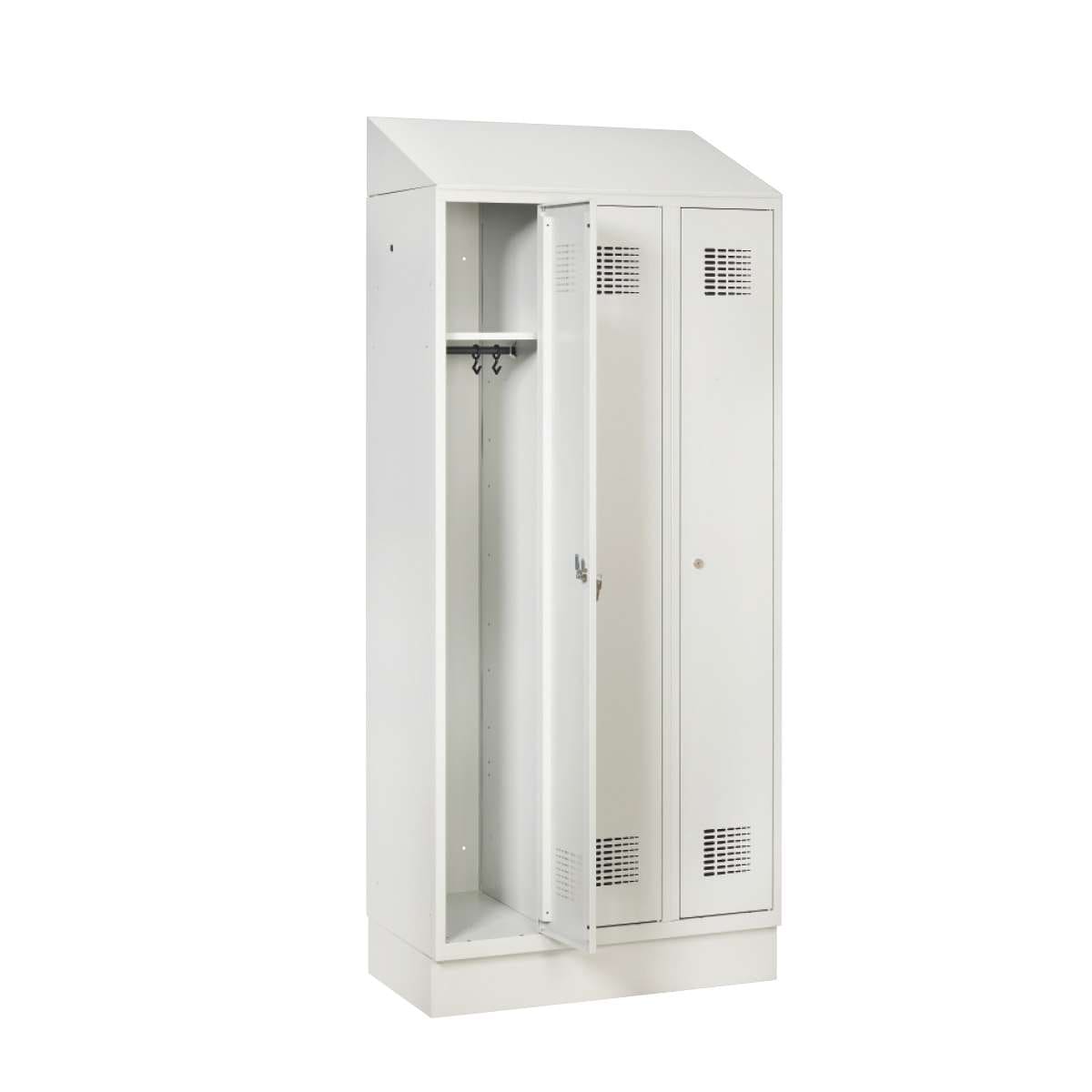 When fitted to a Handy Ewo locker with a plinth, the total height is 1940 mm. The sloping profile gives the locker bank a cleaner, more finished look and makes changing rooms, staff facilities and other shared areas easier to keep in order.