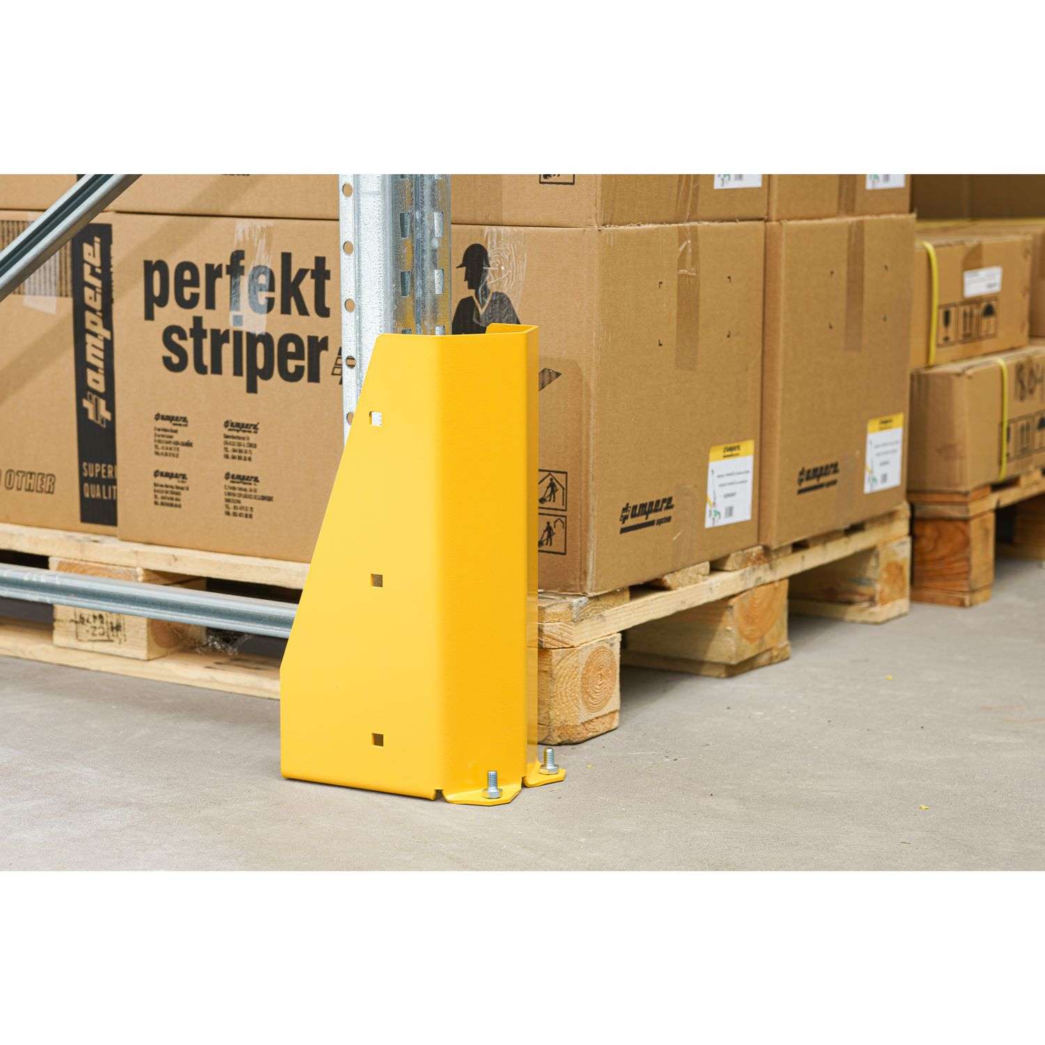 This 400 mm high pallet racking upright protector is made from steel, hot-dip galvanised and then powder coated for long service life. The high-visibility yellow RAL 1004 finish stands out clearly in mixed traffic areas, helping drivers spot the rack line early. The guard is installed to the floor with wedge anchors and is SFS‑EN tested.