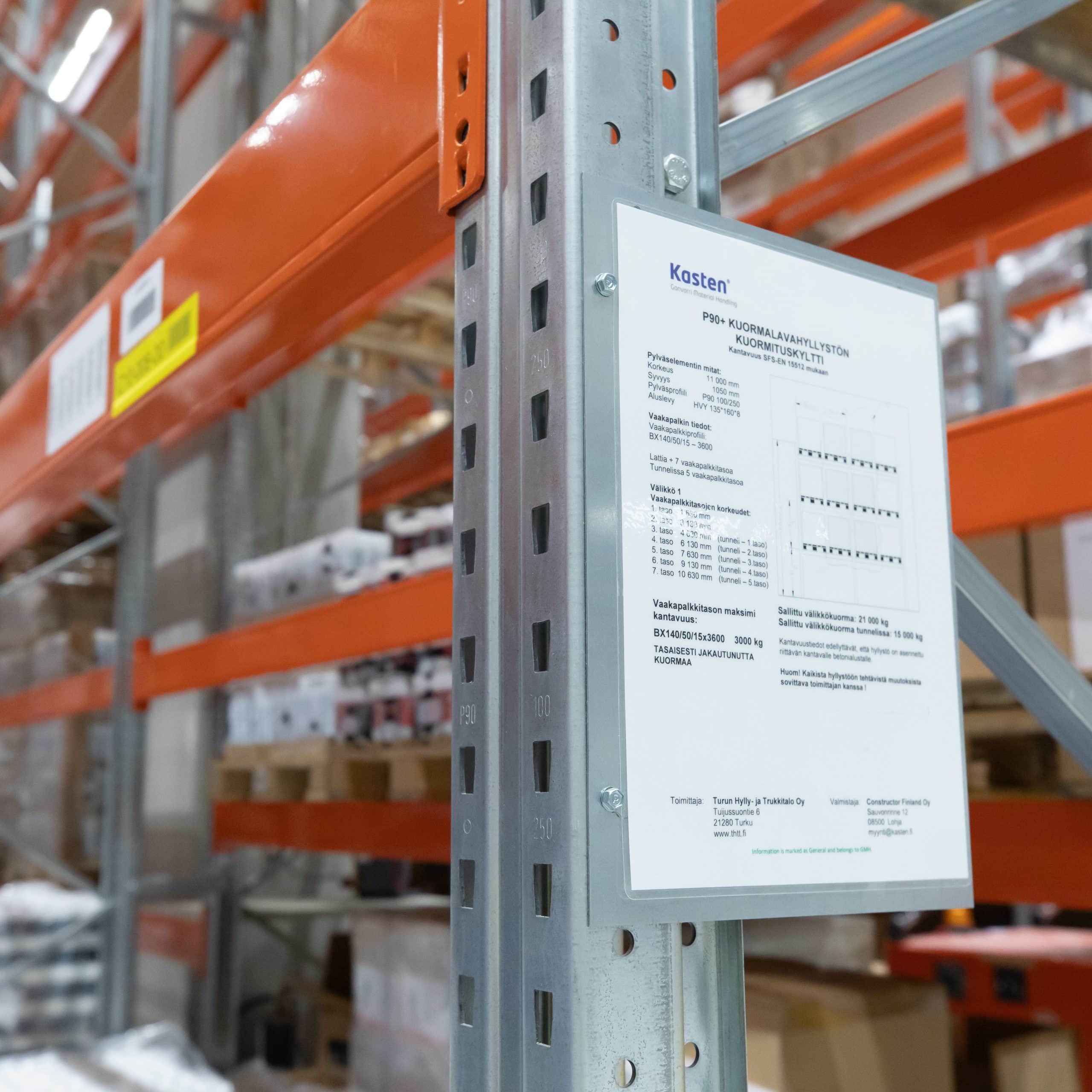 Kuormituskyltistä ilmenee hyllyjen kuormituskapasiteetti, toimittaja ja toimituspäivä. Kyltti tulee kiinnittää pylväselementtiin näkyvälle paikalle.