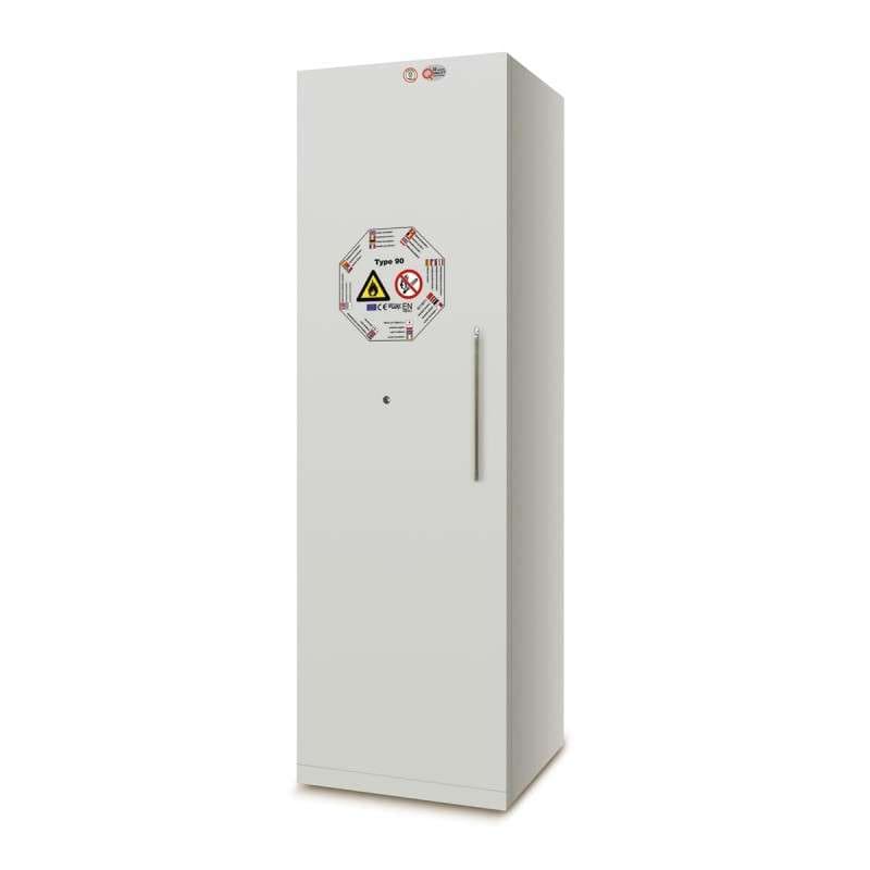 Det här är ett 1-dörrars brandsäkert kemikalieskåp för inomhusförvaring enligt EN 14470-1, med 90 minuters brandskydd. Skåpet passar för brandfarliga vätskor och lämpar sig även för frätande ämnen, vilket gör det till ett praktiskt val i verkstad, produktion, lager och laboratoriemiljö.
