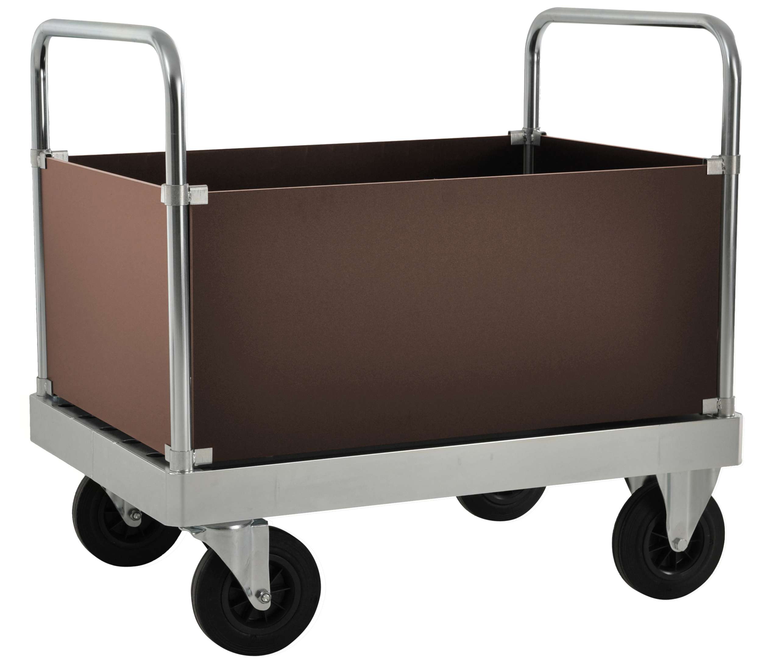 Det här är en transportvagn för miljöer där utrustningen måste tåla återkommande användning. Ramen är tillverkad i elförzinkad metall, vilket ger en slitstark yta som lämpar sig väl för lager, industri och andra arbetsmiljöer där vagnen utsätts för dagligt slitage. Plattformen är tillverkad i laminatskiva och kompletteras av laminatpaneler som bidrar till en robust helhet med god hållbarhet över tid.