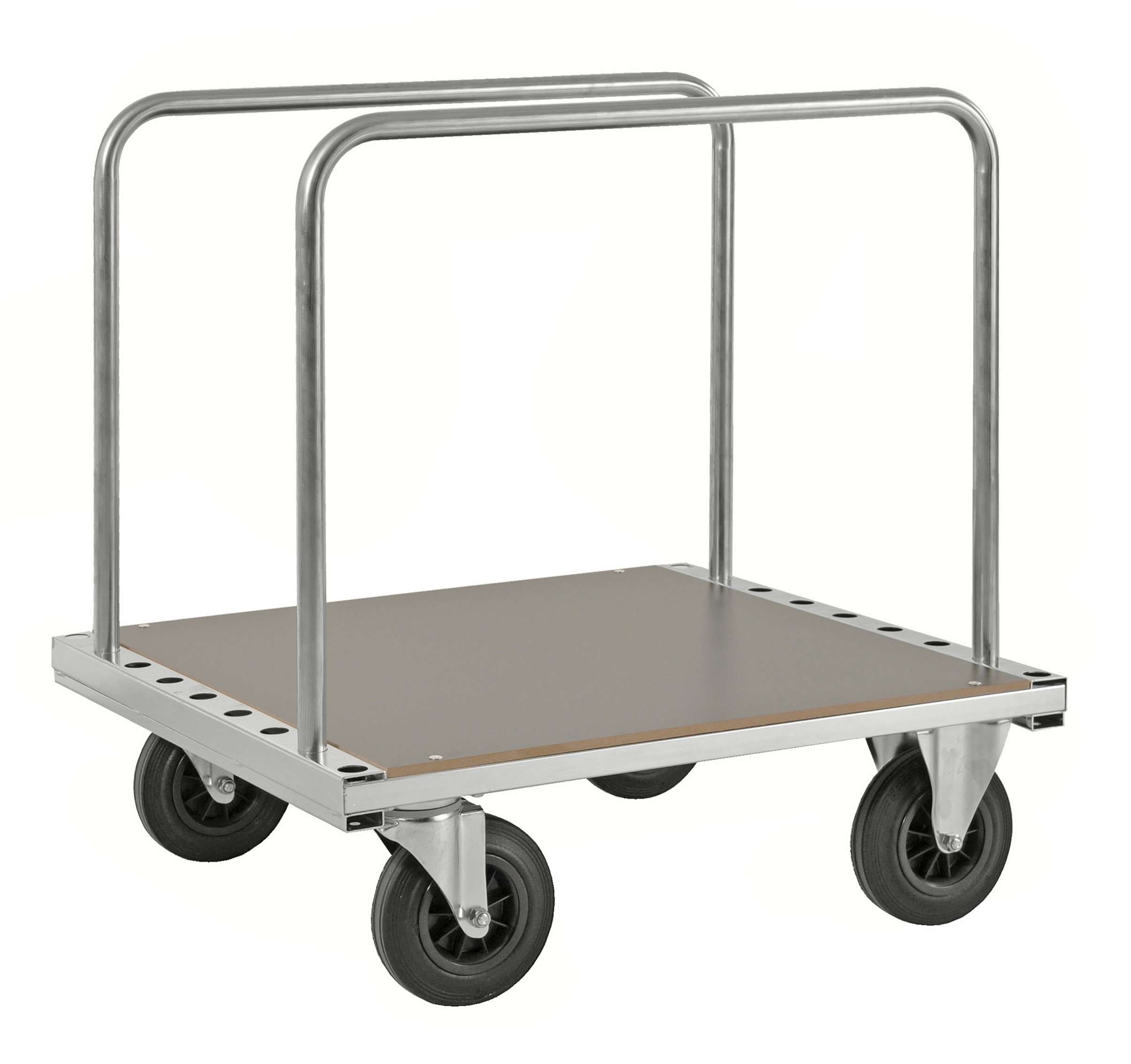 Skivvagnen är utrustad med fyra massiva gummihjul, varav två fasta och två svängbara. Hjuldiametern på 200 mm gör vagnen lätt att rulla och ger samtidigt hög bärighet. Du kan välja mellan en obromsad eller bromsad version beroende på hur och var vagnen ska användas.