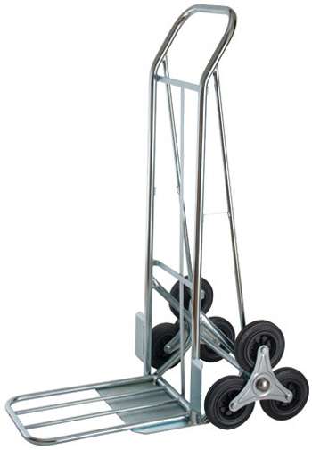 Det trehjuliga stjärnhjulet fördelar lasten jämnt mellan trappstegen och ger mjuk gång uppför och nedför. Underhållsfria glidlager eliminerar behovet av smörjning. Handtaget är ett rejält bygelhandtag i 25 mm stålrör som skyddar knogarna vid passager nära vägg och räcke.