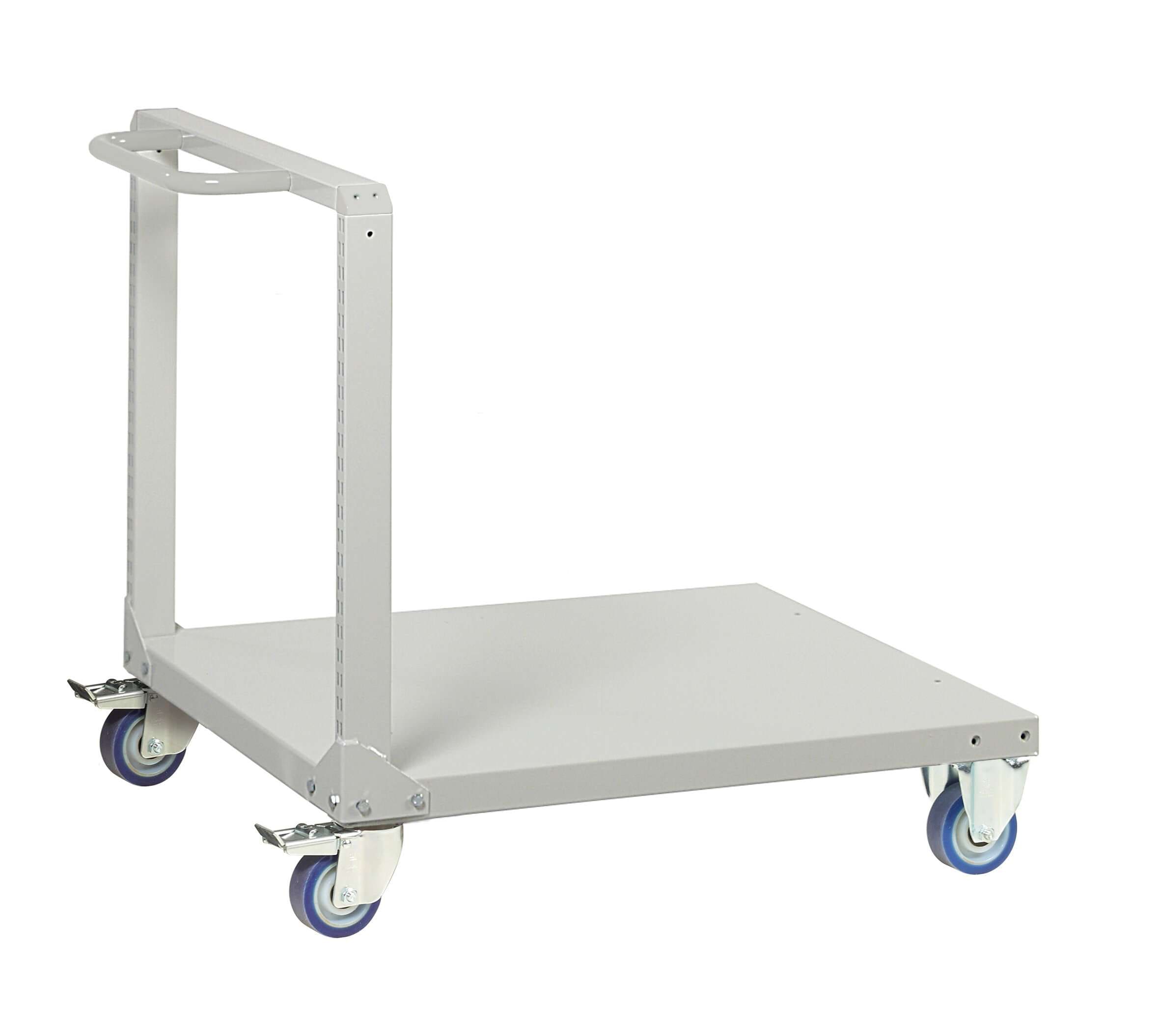 Pulverlackeringen hjälper till att skydda ytan, samtidigt som den ljusgrå kulören gör vagnen lätt att passa in i många olika arbetsmiljöer. Konstruktionen känns tydlig och funktionell snarare än komplicerad, och det är ofta precis det man vill ha i en transportvagn som ska användas mycket.