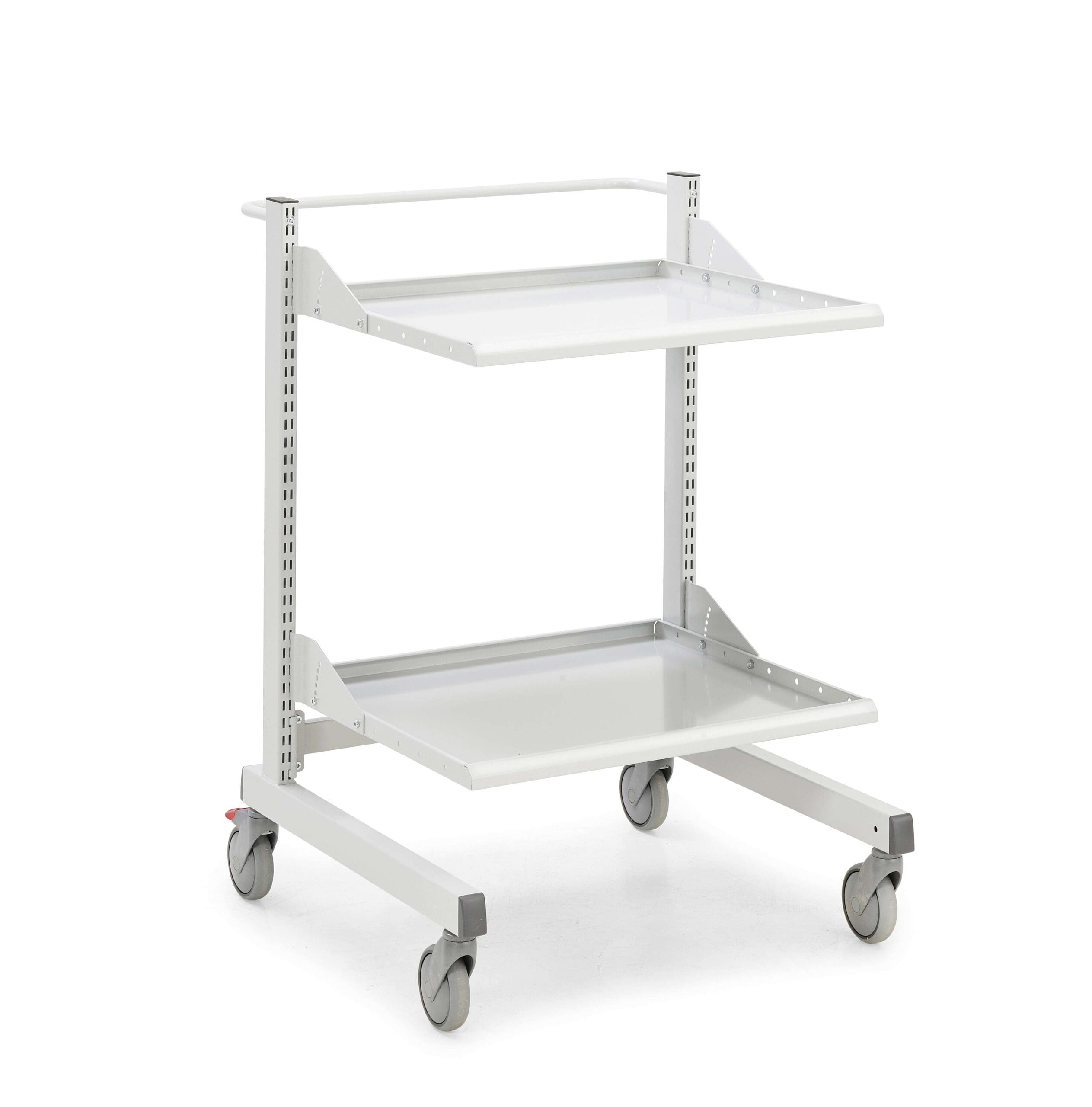 De två hyllorna kan justeras i höjdled med 30 mm intervall och vinklas i fem steg mellan 0–25°, så att vagnen kan anpassas för plockning, mellanlagring och arbete nära stationen. Fyra svängbara länkhjul, varav två med broms, ger mjuk körning mellan arbetsstationer.