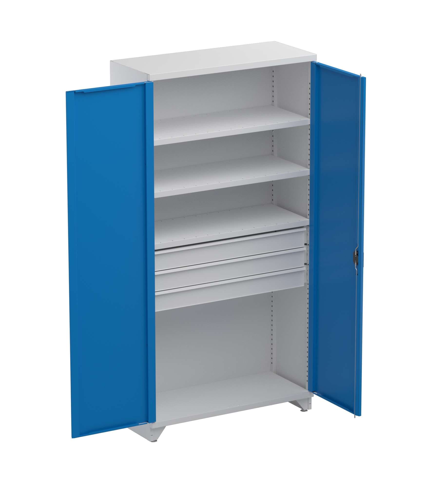 Det här Treston verktygsskåpet ger ordning där verktyg, förbrukningsmaterial och dagliga tillbehör behöver finnas samlade på ett och samma ställe. Kombinationen av tre höjdjusterbara hyllor och tre lådor gör det lätt att dela upp innehållet så att ofta använda saker ligger nära till hands, medan tyngre eller större artiklar får en tydlig plats bakom dörrarna. För verkstad, lager och industri är det en lösning som sparar tid varje arbetsdag.