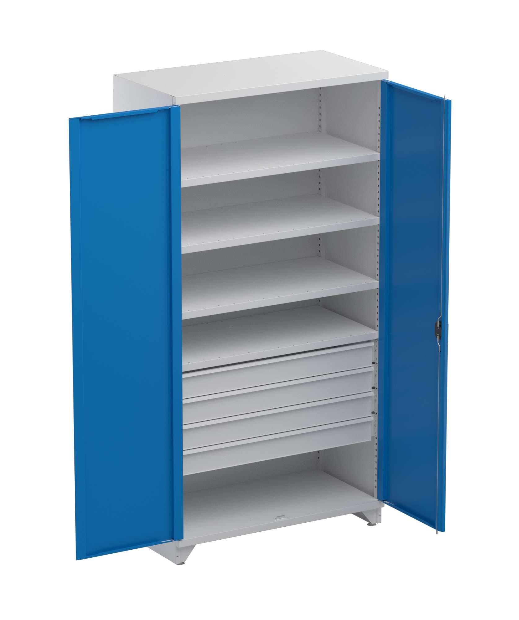 Fyra höjdjusterbara hyllor ger plats för verktyg, lådor och tillbehör, medan fyra lådor gör det lättare att hålla ordning på smådelar och annat som ska vara snabbt åtkomligt. Under skåpet finns justerbara fötter som underlättar placeringen på ojämna golv, och den pulverlackerade stålstommen är gjord för daglig användning i krävande miljöer.