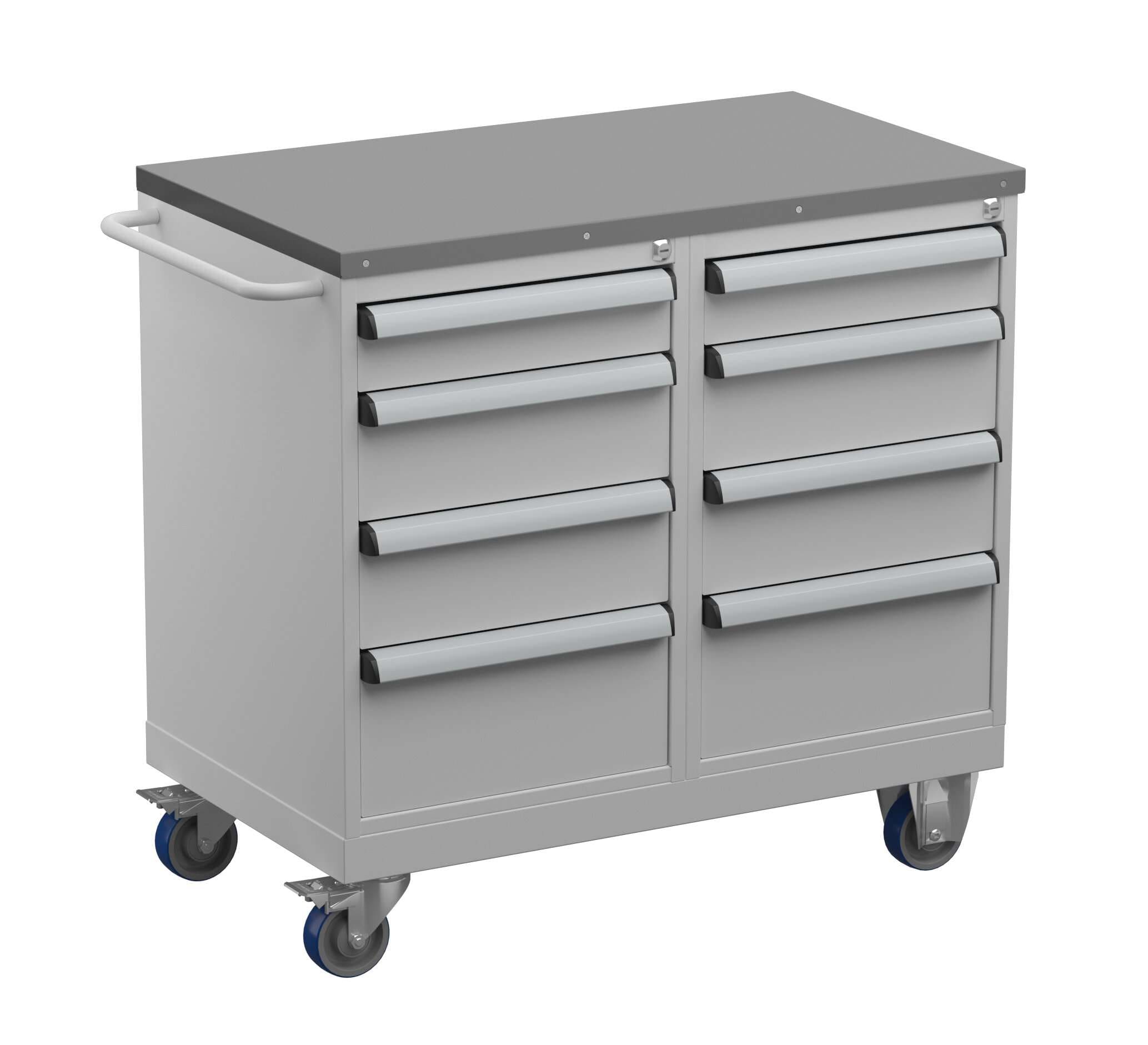 Treston verktygsvagn 3 är därför byggd för miljöer där verktyg, reservdelar och småkomponenter används varje dag och där utrustningen ofta måste följa med mellan olika arbetsmoment. Den här modellen kombinerar en tålig stålstomme, en robust stålskiva och åtta fullt öppningsbara lådor i ett format som passar väl i verkstad, underhåll, service och industri.